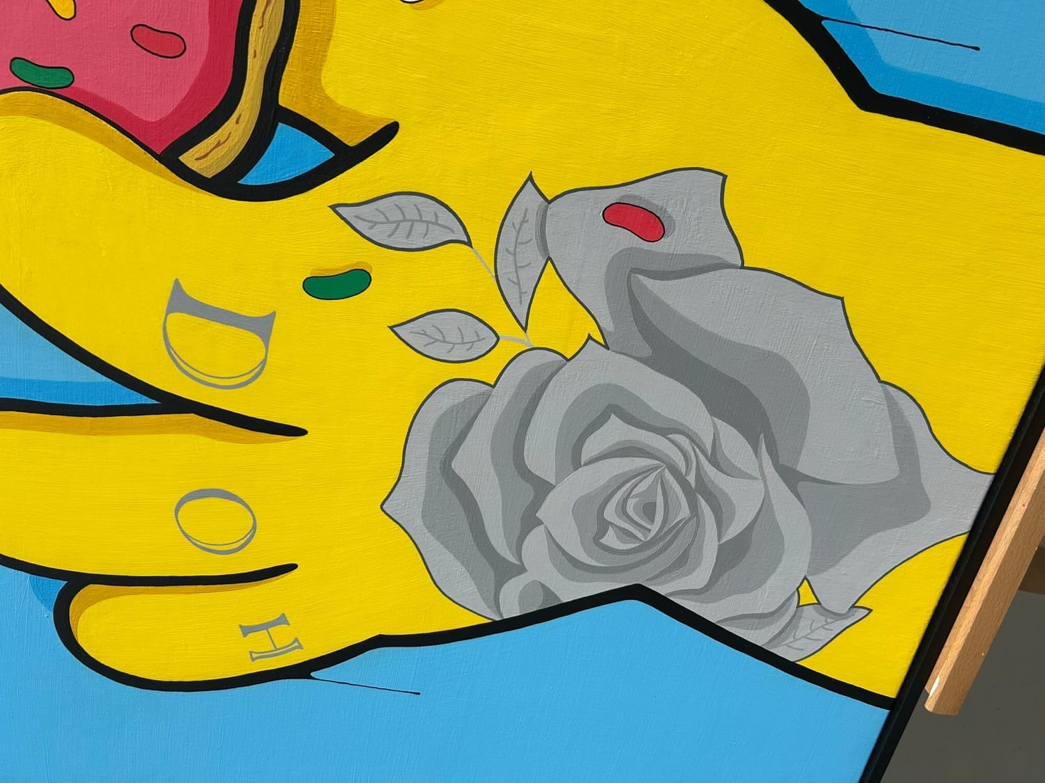 The ‘Hand’made icons collection is a collection of four acrylic paintings that have evolved from the idea of transition, the gradual change from childhood to adulthood, and the ever present feeling of not wanting to grow old.